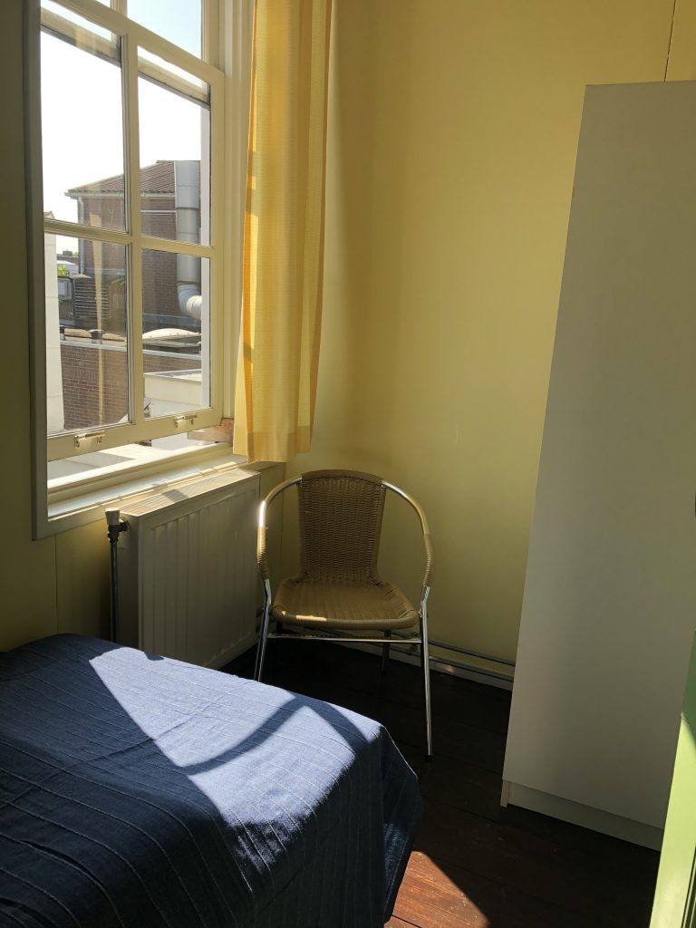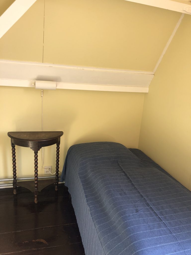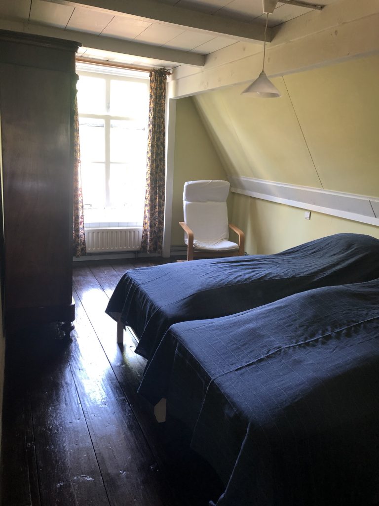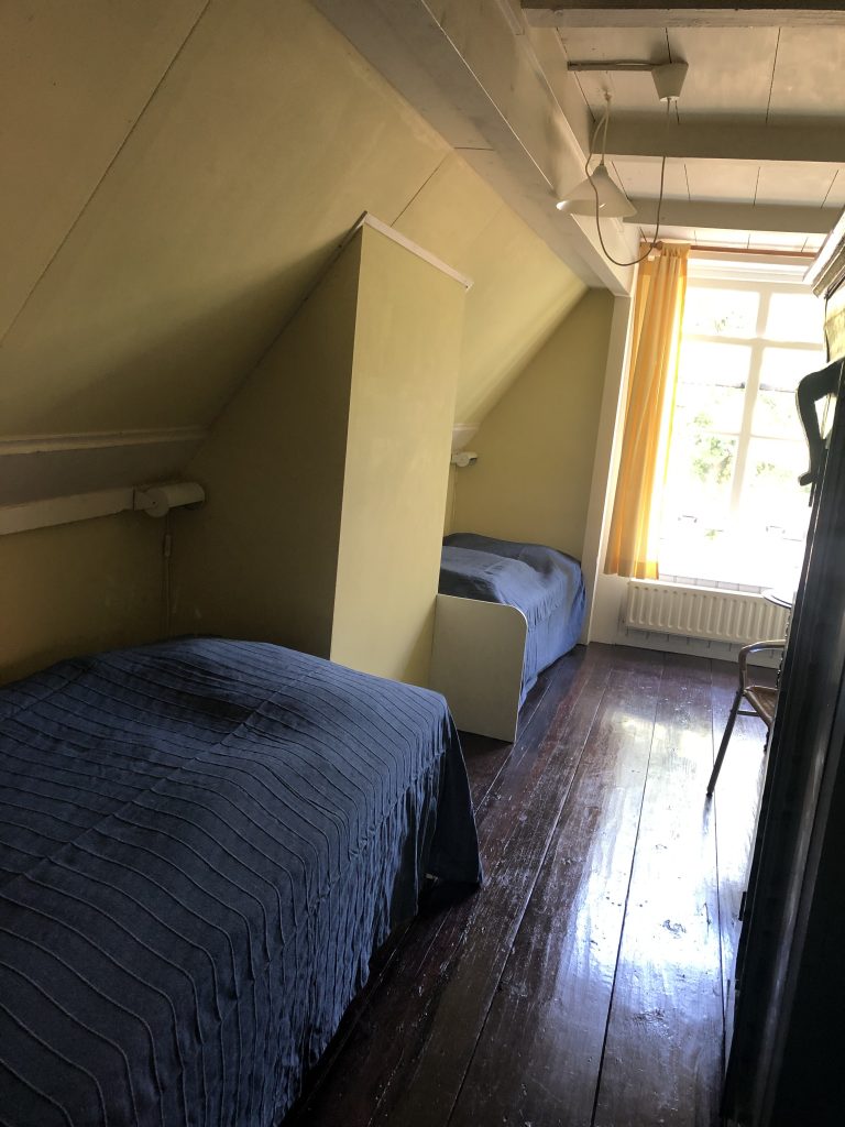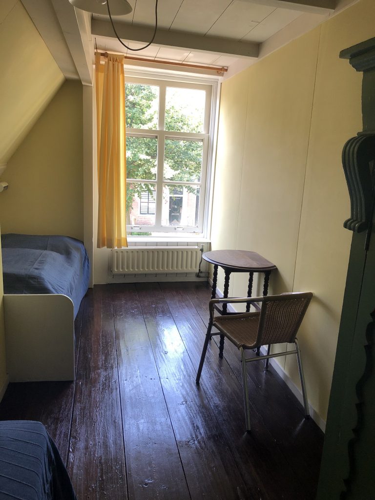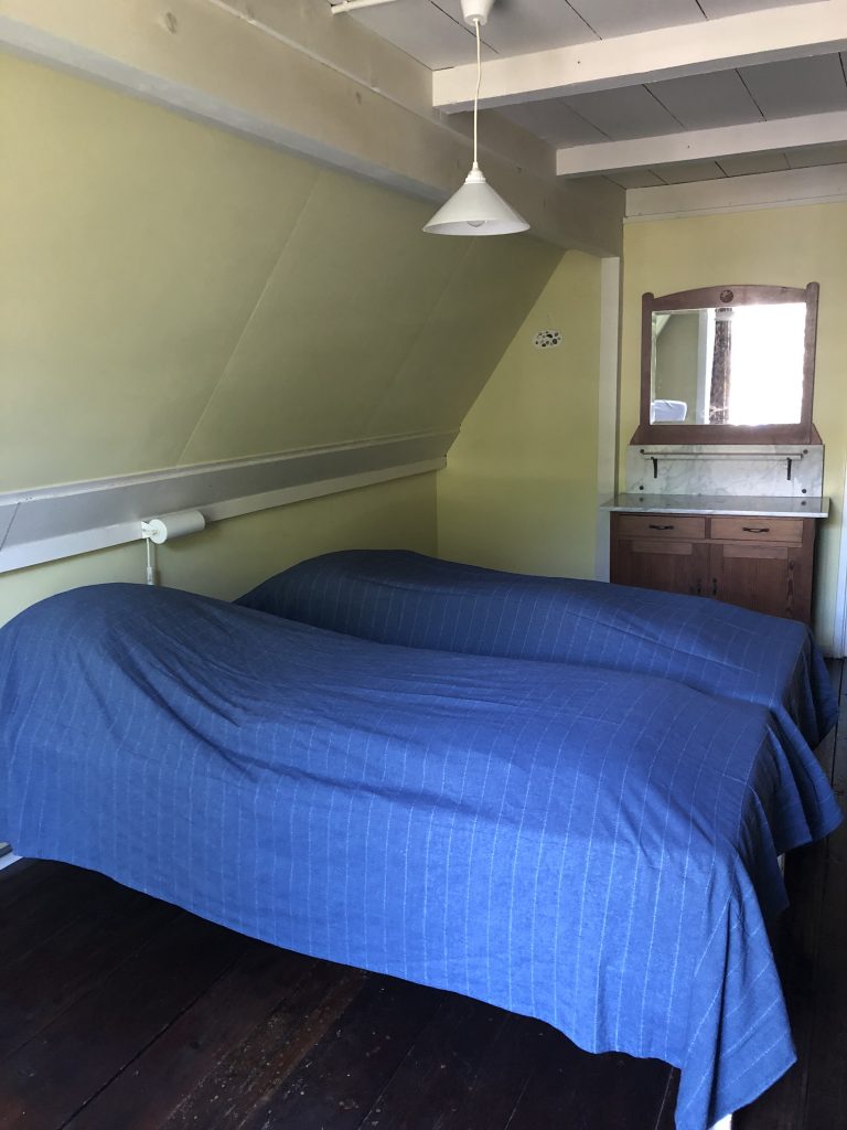 Deze slaapkamer is geschikt voor kinderen. Er staan twee bedden, het bed bij het raam is een iets kleiner ingebouwd bed (80 x 190cm), het andere bed is 90 x 200cm.